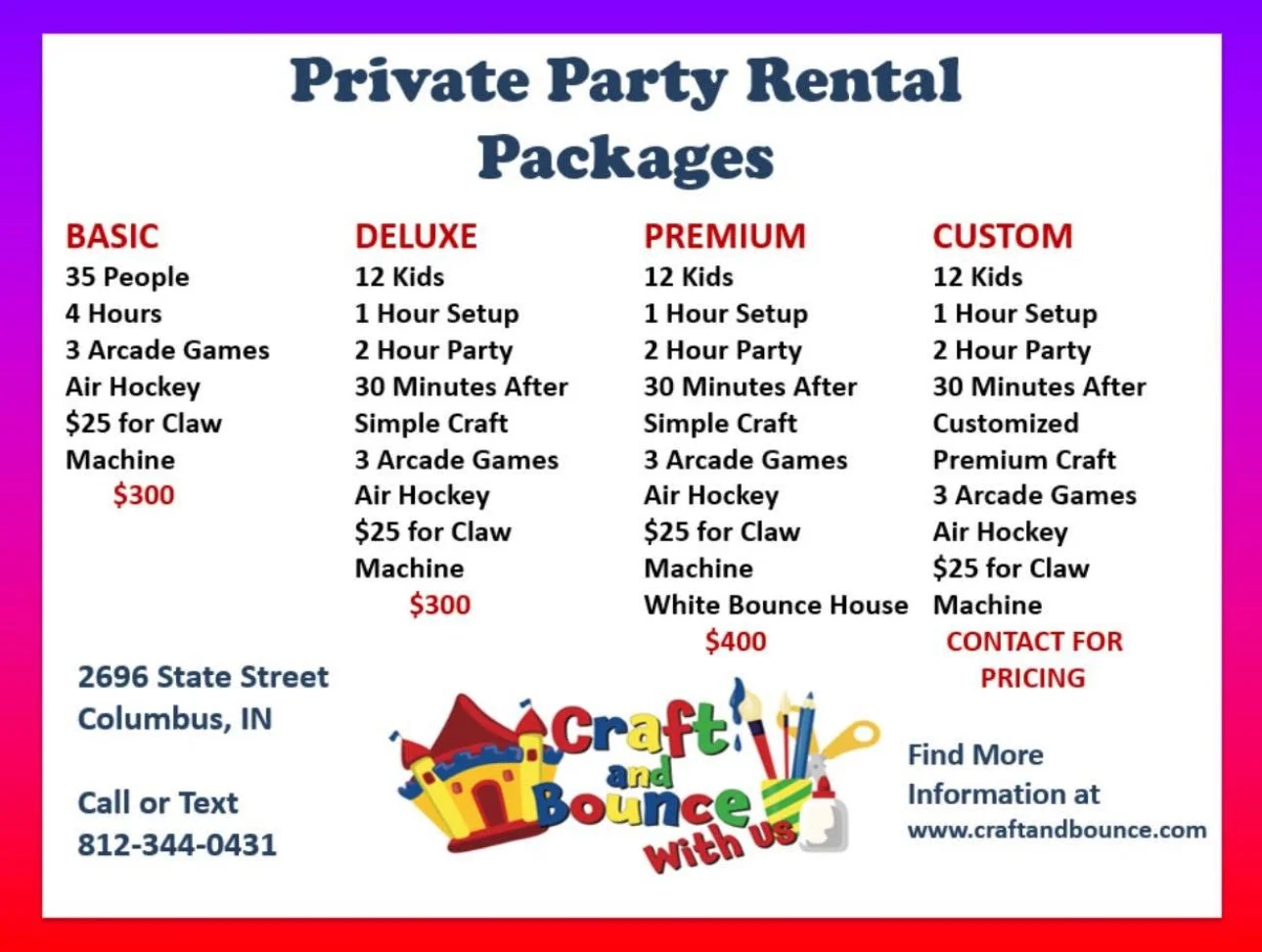 5 Rectangular tables six foot long and 30 Chairs (4 tables and 24 chairs/stools if you add a bounce house).
